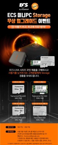 이처럼 다재다능한 ECS LIVA 시리즈 모델 중 글로벌 베스트셀러인 LIVA Z, LIVA ZE PLUS, LIVQ Q, LIVA ZE 등 네 가지 제품군 구매 고객에게 스토리지 무상 업그레이드 이벤트 혜택이 제공된다. 제품군 별 혜택은 △LIVA Q : 트랜센드 MicroSD 64G △LIVA Z : 트랜센드 M.2 SSD 120G △LIVA ZE : 트랜센드 MicroSD 64G △LIVA ZE PLUS : 트랜센드 SSD 120G이다.