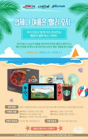 MX500 M.2 출시를 기념하여 진행되는 ‘언제나 여름은 빨리 오지~’ 이벤트는 5월 24일부터 7월 1일까지 행사 기간 동안 마이크론 SSD대원CTS 마이크론 정품 제품 구매자를 대상으로 진행된다.