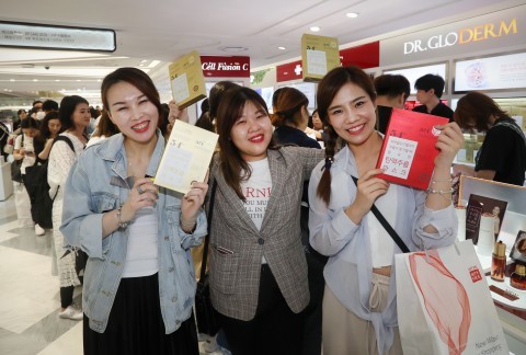 | 서울 중구 소공동 롯데면세점에서 한글 포장 마스크팩을 구입한 외국인 관광객들 |