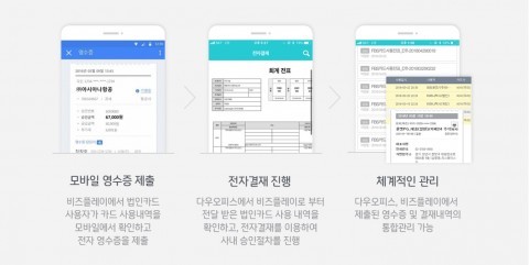 비즈플레이는 기존 종이 영수증을 모바일 애플리케이션 기반의 전자 영수증으로 대체하고, 사용 내역 확인부터 최종 결재까지 전체 경비지출관리 과정을 스마트폰과 PC로 실시간 처리할 수 있는 서비스다. 기존에 종이 영수증으로 지출 증빙을 관리하거나 별도 시스템을 통해 경비를 관리하던 기업은 다우오피스 내에서 보다 편리하게 비즈플레이 서비스를 이용할 수 있게 된다.