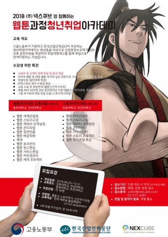 청년취업아카데미 ‘웹툰 신인작가과정’과 ‘웹툰 스토리작가과정’은 고용노동부와 산업인력공단이 주관하고 넥스큐브가 진행하는 사업으로, 웹툰 전문 인력을 양성하고자 개설되는 과정이다. 해당 교육은 취업을 연계하여 수강할 수 있는 교육과정이며 교육비 및 교재와 중식이 전액 무료로 지원되는 사업이다.