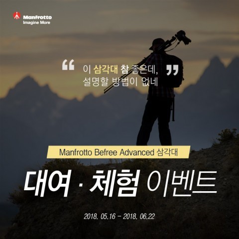 맨프로토의 대표 트레블러 삼각대인 Befree Advanced를 대상으로 진행하는 이번 이벤트는 구매자를 대상으로 사은품을 증정하는 ‘Befree Advanced 구매’ 이벤트와 삼각대를 사전 체험해 볼 수 있는 ‘Befree Advanced 대여’ 이벤트를 진행한다. 동시에 Befree Advanced 삼각대의 특징인 이지링크(Easy Link)를 저렴한 가격에 만나볼 수 있는 ‘Befree Advanced 패키지’ 할인 판매 이벤트도 진행 중이다.