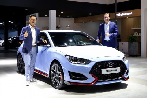 | 2018 부산 국제 모터쇼에서 공개된 현대자동차 벨로스터 N 차량과 현대자동차 국내영업본부장 이광국 부사장(왼쪽), 현대자동차 고성능사업부 담당 토마스 쉬미에라(Thomas Schemera) 부사장 |