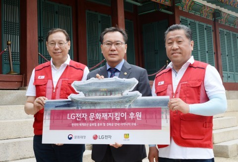 | LG전자와 문화재청이 8일 경복궁에서 문화유산을 보호하고 알리기 위한 후원행사를 열었다. 왼쪽부터 조성진 LG전자 부회장, 김종진 문화재청장, 배상호 LG전자 노조위원장 |