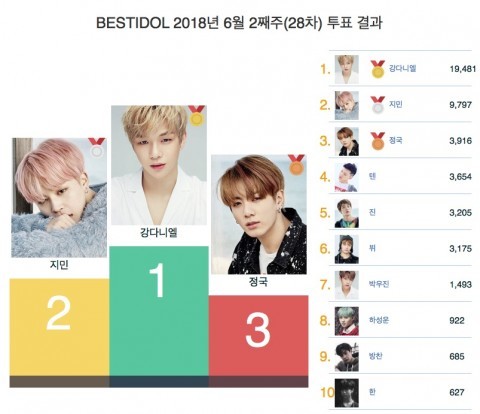 6월 2주차 베스트 아이돌 투표에서도 강다니엘(워너원)이 압도적인 차이로 1위를 차지했다. 2위와 3위는 지난 주와 마찬가지로 지민(방탄소년단)과 정국(방탄소년단)이 차지했다. 지민은 4주 연속 2위 자리를 지켰다.