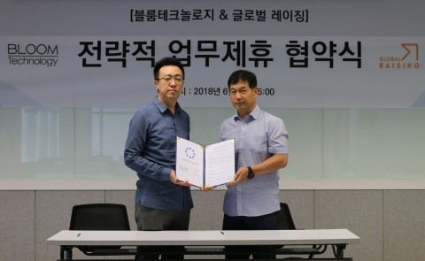 | 블룸테크놀로지의 이상윤 대표이사(좌측)와 글로벌레이징의 kane Kim 대표이사가 업무협약 후 기념촬영을 하고 있다 |