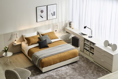 이 침대는 서랍장, 화장대, 벽판넬 등 가구 단품을 패키지로 구성해 마치 호텔스타일의 맞춤 가구를 주문한 듯 통일감 있는 공간을 만든다. 또, 침대와 가구 단품을 조합해 ‘ㄱ자형’, ‘ㅡ자형’, ‘대면형’, ‘패밀리명’, ‘트윈형’ 등 5가지 배치가 가능하다. 화장대의 깊이와 벽판넬의 가로길이를 기존모델보다 약 10cm 줄여 공간활용도를 높였다.
