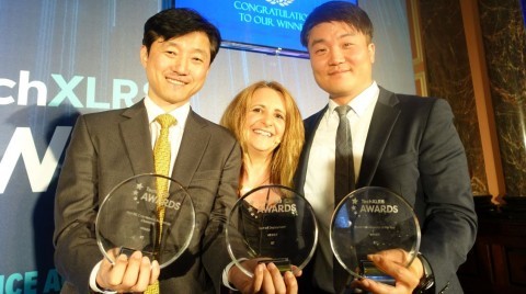 | 5G 월드 어워드 2018(5G World Awards 2018) 시상식 현장에서 왼쪽부터 KT 정준호 팀장과 사회자 루시포터(Lucy Porter), KT 송민관 과장이 수상 기념 포즈를 취하고 있다 |