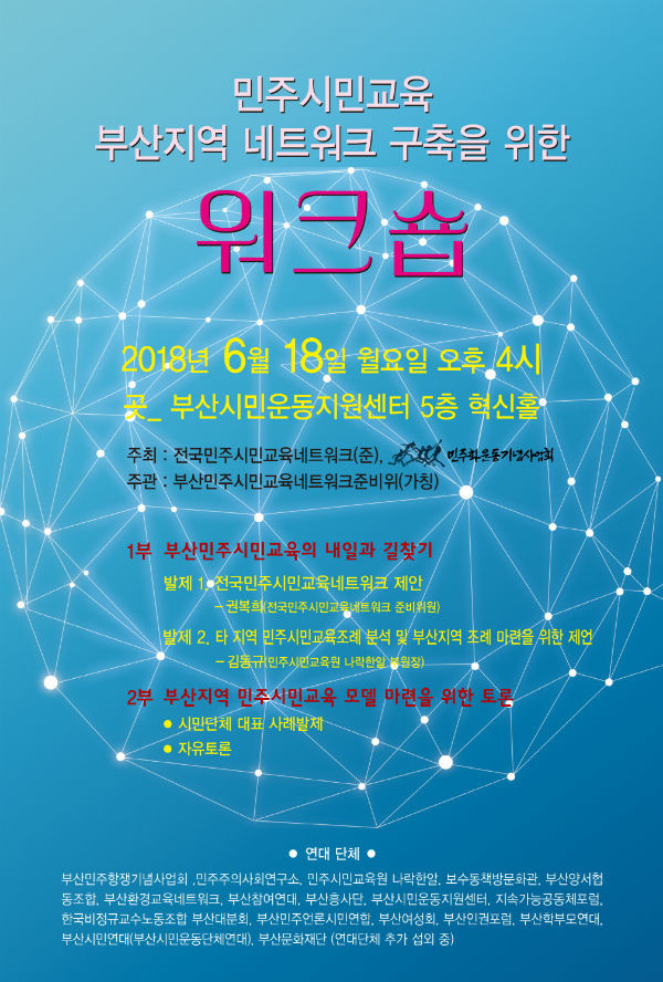 부산 지역에서는 민주시민교육원 나락한알을 중심으로 부산참여연대, 양서협동조합, 부산민주언론시민연합, 부산문화재단 등 16개 시민사회단체가 5월 ‘부산민주시민교육 네트워크 준비위원회(가)’를 구성한 바 있다. 민주시민교육 네트워크 구성을 위한 이번 간담회는 전국적으로 다섯 번째 간담회에 해당한다.