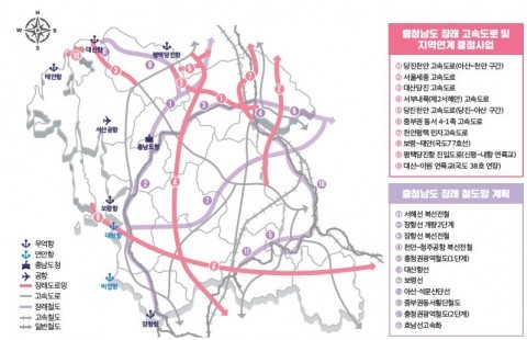 충남은 현재 7개 고속도로와 5개 철도 노선이 있으며 장래 7건의 고속도로(진행 중 2건, 추진예정 2건, 장래 3건)와 11건의 철도(진행 중 2건, 추진예정 3건, 장래 6건) 사업을 계획하고 있는 것으로 나타났다.