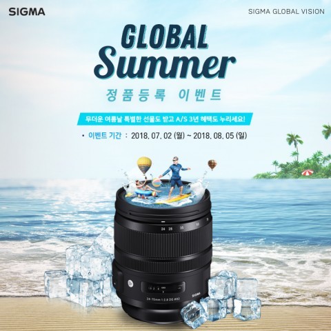 본격적인 여름 바캉스 시즌을 맞이하여 진행되는 이번 이벤트는 총 27종의 글로벌비전 렌즈를 대상으로 제품 구입 후 정품 등록 시 A/S 기간 추가 2년(총 A/S기간 3년 제공, 초점교정기간 동일) 혜택과 시그마 텀블러를 사은품으로 증정하며, 2018년 7월 2일부터 8월 5일까지 행사 기간 내 제품 구해 후 8월 10일까지 정품 등록을 마치면 자동으로 응모된다.