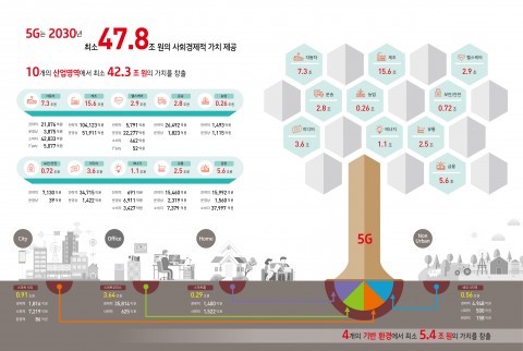 이 밖에도 5G로 2030년에는 △헬스케어 2.9조원 △운송 2.8조원 △농업 0.26조원 △보안/안전 0.72조원 △에너지 1.1조원 △유통 2.5조원 △금융 5.6조원 등 10개 산업 분야에서 최소 42조3439억 원의 사회경제적 효과가 발생할 것이라 추산했다.