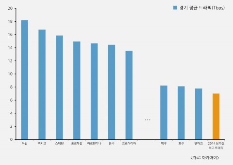 16강 진출 국가 별 전세계 평균 트래픽을 살펴보면 한국과 같은 조에 속한 독일(18.18Tbps), 멕시코(16.75Tbps), 스웨덴(15.84Tbps)이 상위 3개국에 올랐다. 한국이 참가한 경기의 평균 트래픽은 14.42Tbps를 기록해 6위를 차지했다.