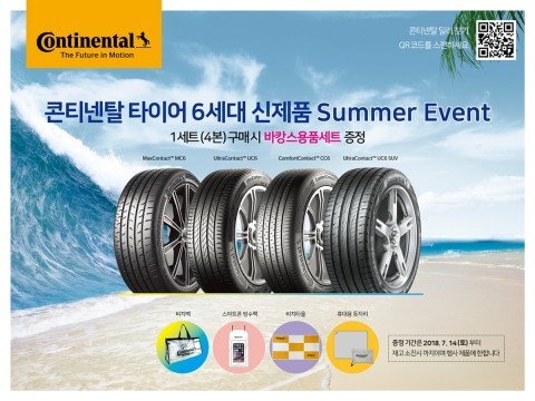 콘티넨탈은 첨단 기술이 집약된 6세대 타이어 제품 1세트(4개)를 구매하는 고객에게 휴가철 필수품인 비치백, 비치타월, 휴대용 돗자리, 스마트폰 방수팩으로 구성된 바캉스용품 세트를 재고 소진 시까지 증정한다.