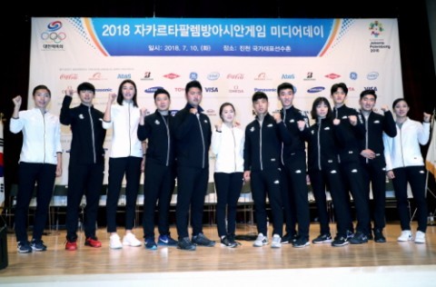 | 2018자카르타팔렘방AG 미디어데이 행사에서 선수들이 포즈를 취하고 있다 |