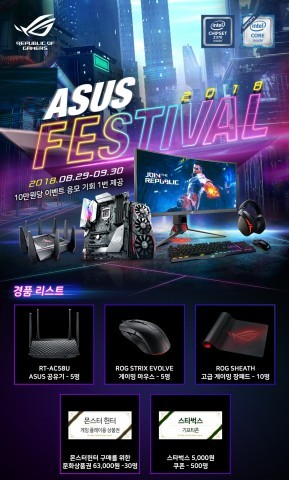 2018 ASUS Festival은 메인보드, 그래픽 카드, 게이밍 마우스, 모니터 등 ASUS의 다양한 제품들이 이벤트 대상에 해당되며, 해당 제품들을 구매 시 10만원당 이벤트 응모 기회가 1번씩 제공된다.