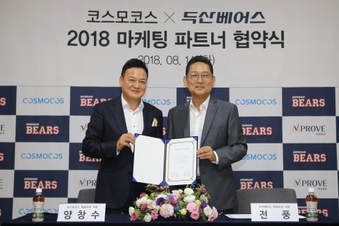 글로벌 뷰티 선도 기업 코스모코스가 인기 프로야구 구단 두산베어스와 함께 8월 14일(화) 잠실 경기장 VIP룸에서 공동 마케팅에 관한 업무 협약식을 가졌다고 5일 밝혔다.
