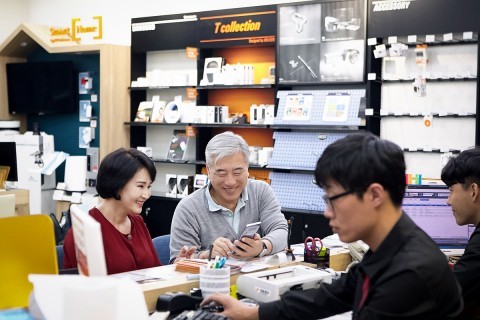| 어르신들이 SK텔레콤 직원들에게 휴대폰 상담을 받고 있다 |