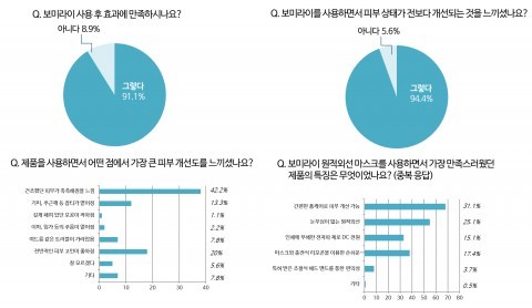 체험단 90명이 참여한 설문 조사에 따르면 응답자의 91.1%가 보미라이 사용 후 효과에 만족한다고 답했으며 94.4%는 제품을 사용하면서 피부 상태가 개선되었다고 느꼈다. 체험단이 경험한 보미라이의 피부 개선 효과는 ‘건조한 피부의 보습 효과(42.2%)’, ‘전반적인 피부 고민 개선(20%)’, ‘기미, 주근깨 등 잡티 개선(13.3%)’ 순으로 나타났다. 지인 추천 의사와 제품 구매 의사는 각각 92.2%와 82.2%의 응답을 보여 전반적으로 높은 제품 만족도를 드러냈다.