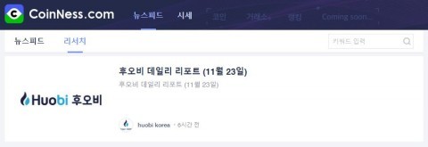글로벌 디지털 자산 거래소 후오비 코리아가 암호화폐 뉴스 플랫폼 코인니스(CoinNess.com)와 손잡고 자체 발행 암호화폐 시장 보고서 ‘후오비 데일리 리포트(Huobi Today’s Report)’ 배포 서비스를 시작한다고 26일 밝혔다.