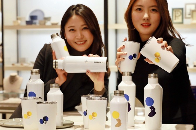 텀블러의 경우 환경을 생각하는 미국 아웃도어 브랜드인 ‘미르(MiiR)’와 콜라보레이션한 제품이며, 보틀은 미국의 스타일리시 텀블러 브랜드 ‘콕시클(CORKCICLE)’과 콜라보레이션 작업을 했다.